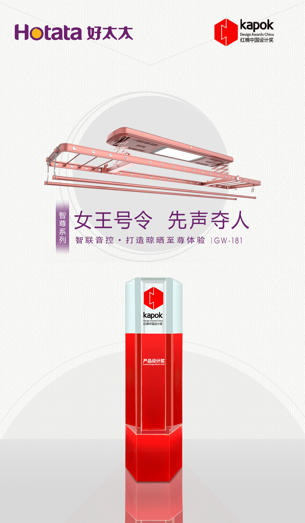 獲評2018紅棉中國設計獎,是好太太集團科技創新和為智能晾曬體驗不懈努力的結果,也是好太太設計力量的體現。