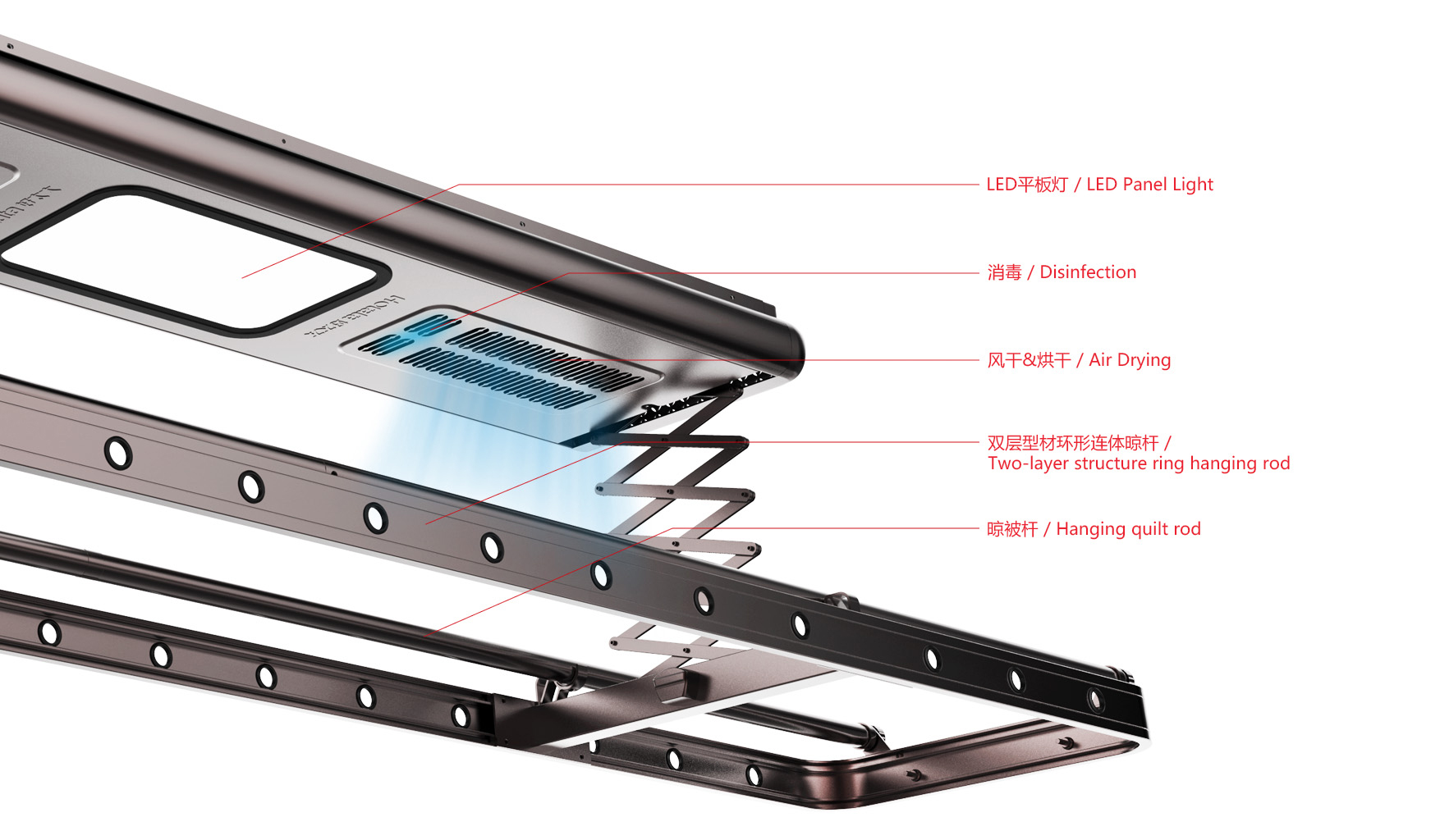 集合升降、照明、消毒、干衣等多重功能于一體,一鍵操控,讓晾曬變得輕松簡單。