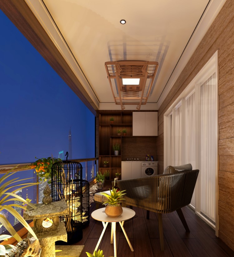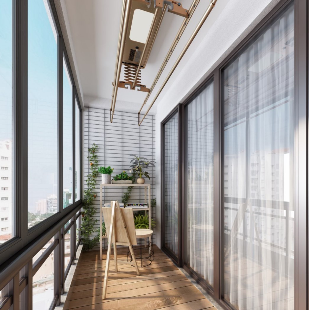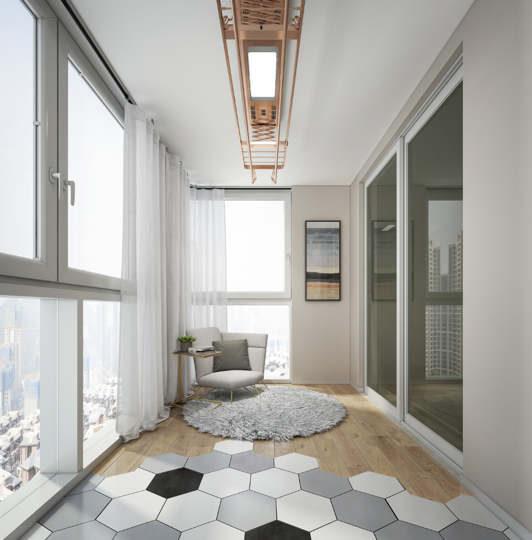 在本次金企鵝美居設(shè)計(jì)大賽中,一等獎(jiǎng)設(shè)計(jì)師曾炎威將陽(yáng)臺(tái)原有的護(hù)欄,改為上部可推拉式落地窗,且不影響采光通風(fēng)的條件下也保證了業(yè)主的私密性及安全感。在空間布置上以地面材料的形式劃分為休閑區(qū)和工作區(qū)。休閑區(qū)地面為仿實(shí)木木紋磚,工作區(qū)域?yàn)楹凇住\灰三種顏色的六角磚,黑白灰與原木肌理的交織使空間營(yíng)造出的一種生機(jī)與美感,墻面的米黃暖色基調(diào),融入好太太智能晾衣機(jī),實(shí)用、簡(jiǎn)約,展現(xiàn)陽(yáng)臺(tái)的無限可能。