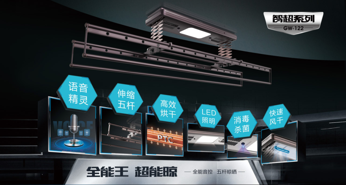 像好太太智能晾衣機GW-122系列,4伸縮桿加1小晾桿的設計就非常實用了。伸縮桿可已在1.6米到2.4米間自由切換,晾曬容量增加50%,最大承重35Kg,可實現同時晾曬10個人的衣物。利用中間的小晾干晾曬孩子衣物、貼身衣物和毛巾等小物件能最大限度的節省空間,并因正對消毒燈,達到最優的消毒效果。