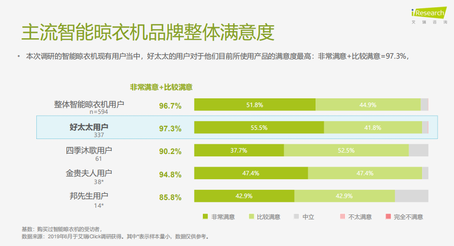 報(bào)告數(shù)據(jù)公開可知,好太太的品牌認(rèn)知度更是達(dá)到78.6%,且調(diào)研的已購(gòu)買和正在使用智能晾衣機(jī)的消費(fèi)者當(dāng)中,近6成購(gòu)買過(guò)好太太的智能晾衣機(jī),他們對(duì)目前所使用產(chǎn)品的滿意度最高達(dá)到 97.3%。數(shù)據(jù)背后體現(xiàn)的是,所有品牌晾曬市場(chǎng)都不及好太太一家的體量大,好太太在業(yè)內(nèi)占不僅是“大牌子”,而是“超級(jí)大牌”。