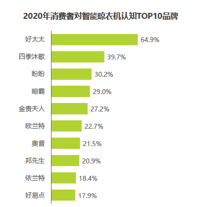 直播當晚,權威調研機構艾瑞發布《智領生活》智能家居用戶洞察報告,用大數據解讀當代人的智能家居消費觀。數據報告表示,好太太的智能晾曬早已“出圈”,超過6成消費者知道好太太品牌,其認知度比第二名高出25.2%,同時有超過60%的消費者計劃在未來半年購買好太太晾衣機,遠遠領先于行業第二。