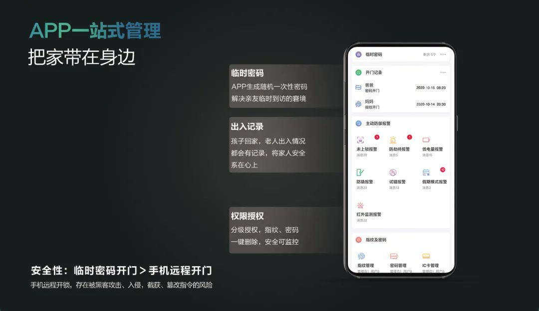 生成臨時(shí)密碼,避免密友門外等候,權(quán)限管理,一鍵添加或刪除指紋、密碼和磁卡。