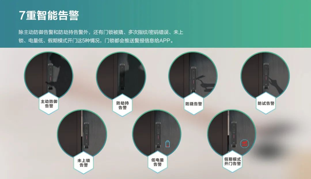7重智能告警,給你貼心守護(hù),防撬、防試、防劫持三重防護(hù),未關(guān)門、低電量雙重提醒,主動(dòng)防御、假期模式兩種智能使用場(chǎng)景