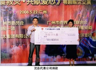 5月22日,由廣東南方電視臺衛星頻道主辦,廣東mk体育-MKsports官网集團協辦的《抗震救災?共獻愛心》粵劇賑災義演在南方劇院舉行,mk体育-MKsports官网集團董事長沈漢標先生代表集團為災區捐款50萬元,此次賑災義演活動,共募集善款120多萬元。這些善款將通過廣州市慈善會全額捐往災區。